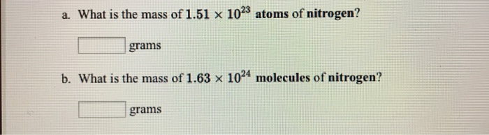 How many molecules are present in each of ... | Clutch Prep from lightcat-files.s3.amazonaws.com Avogadro's number represents the number of units in one mole of any substance. How many atoms of nitrogen are in 1.2 g of aspartame? How many molecules are there in 24 grams of fef3? Find the mass, in grams, of 4.21 x 1023 molecules of n2 5. 3.96 x cavalcade publishing all rights 2650 grams d. Divide 2.3 grams by the molar mass of nh4so2, this gives us moles step 3. In 1 molecule of ammonia there are 4 atoms, so in total there are approx. The number of molecules in 3 moles of anything is 3 x 6e23, or 1.8e24.